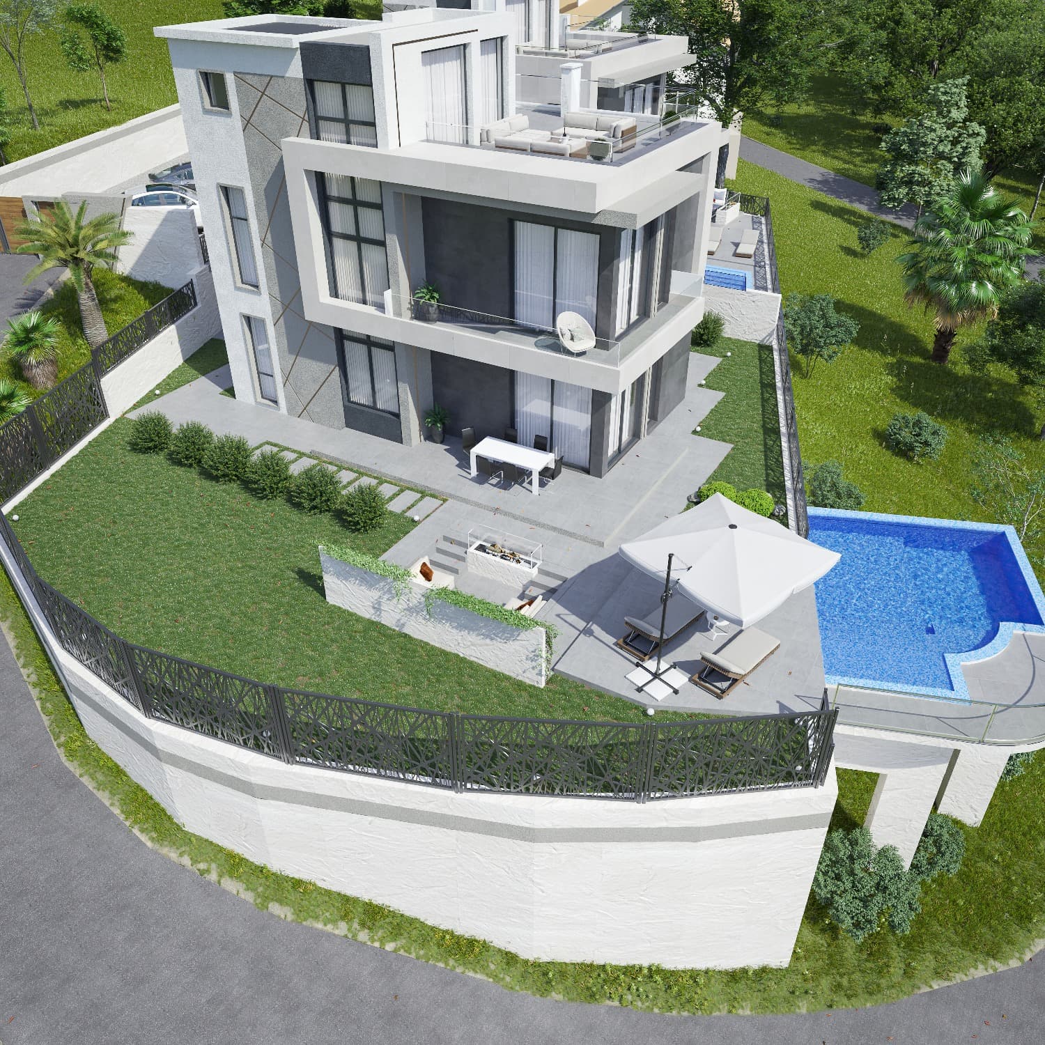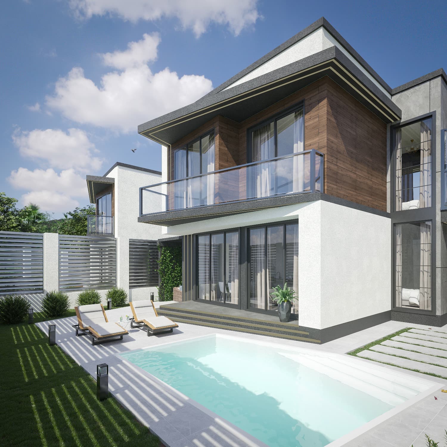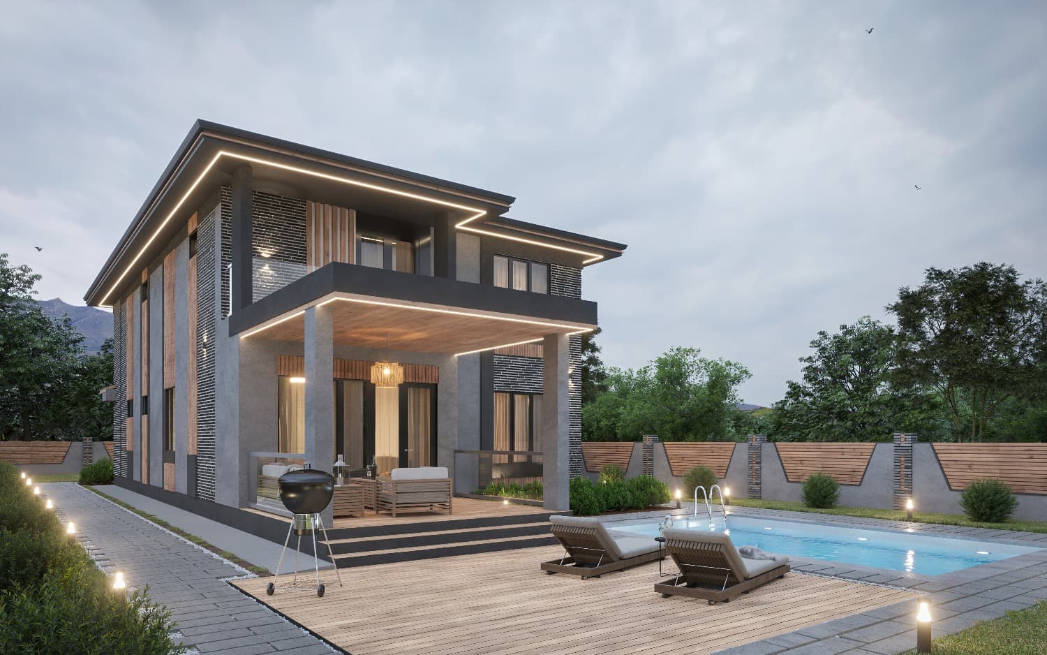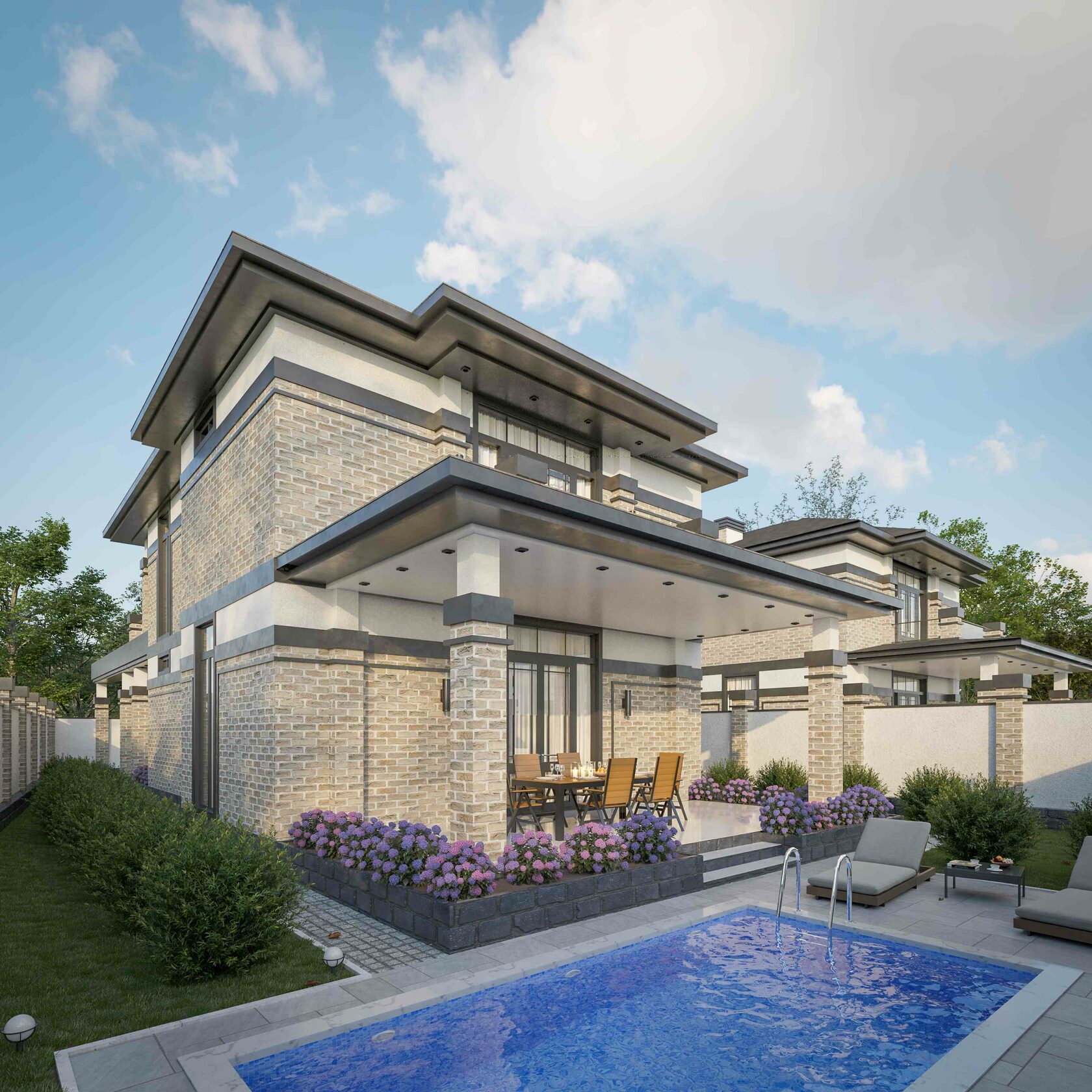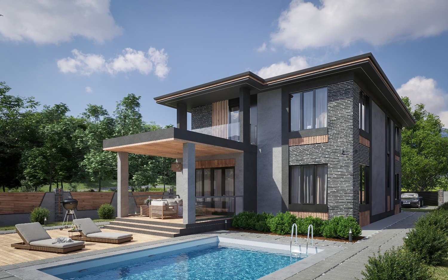 Общая площадь всех этажей с учетом бассейна, террас и балконов - 328,59 м2