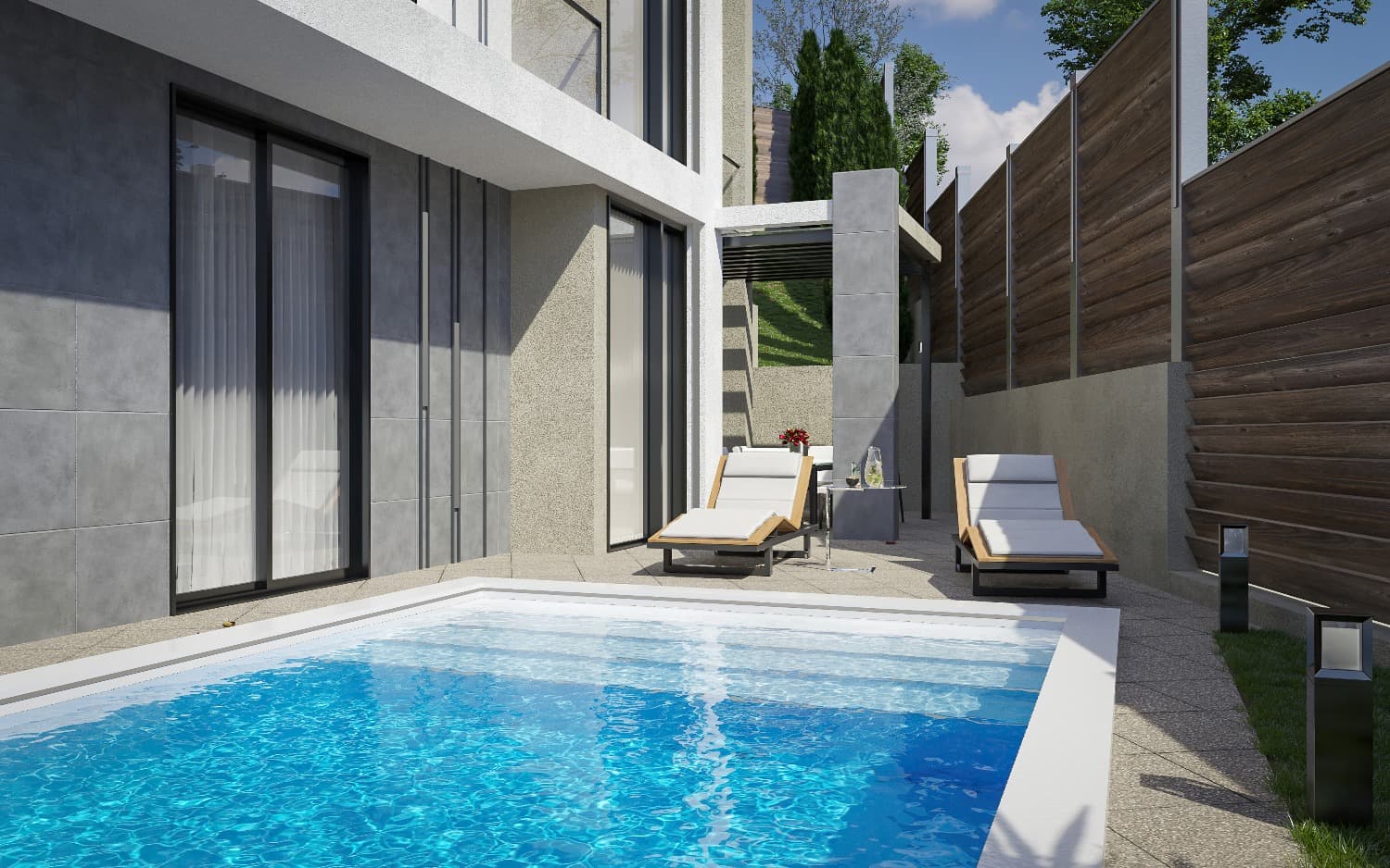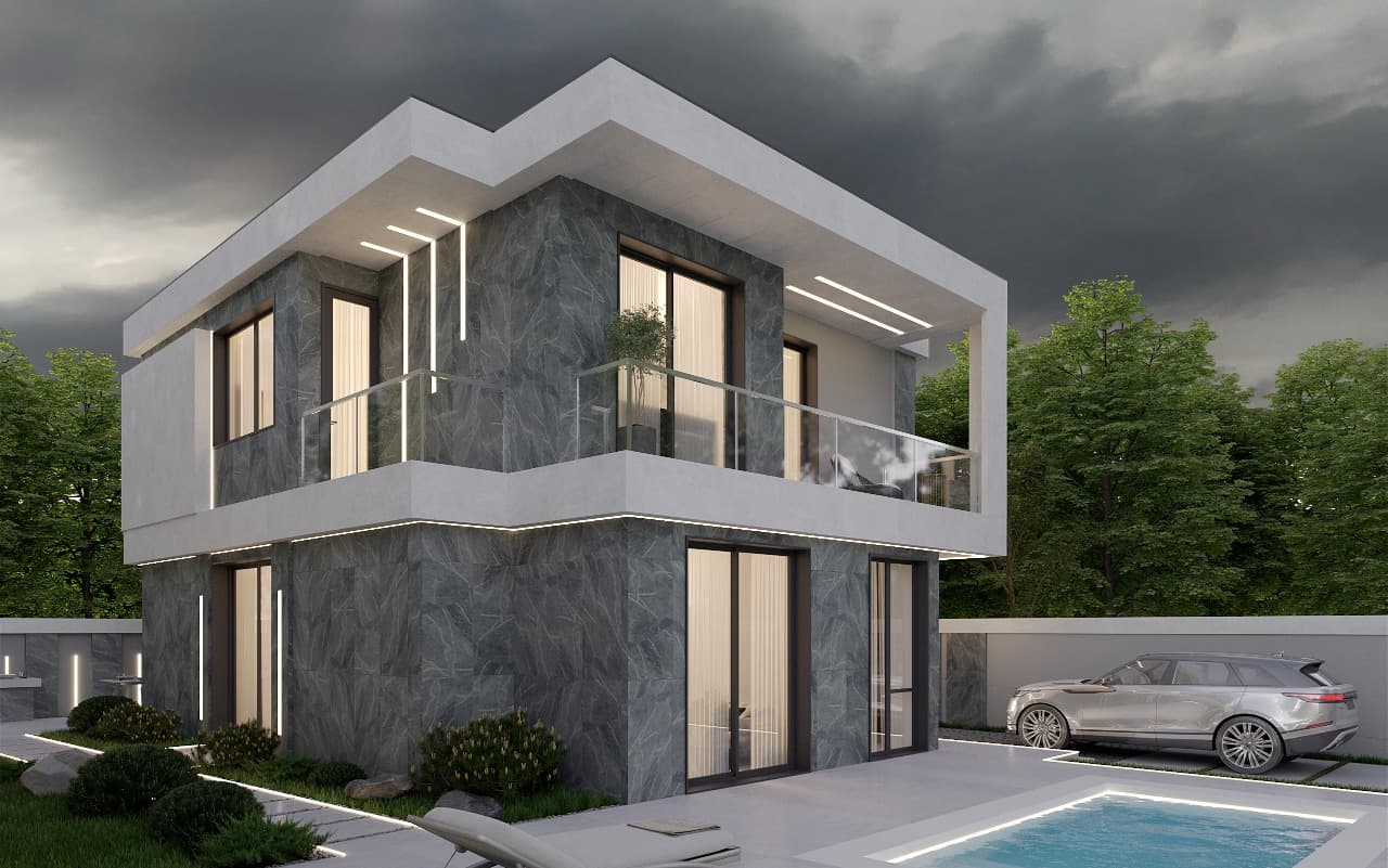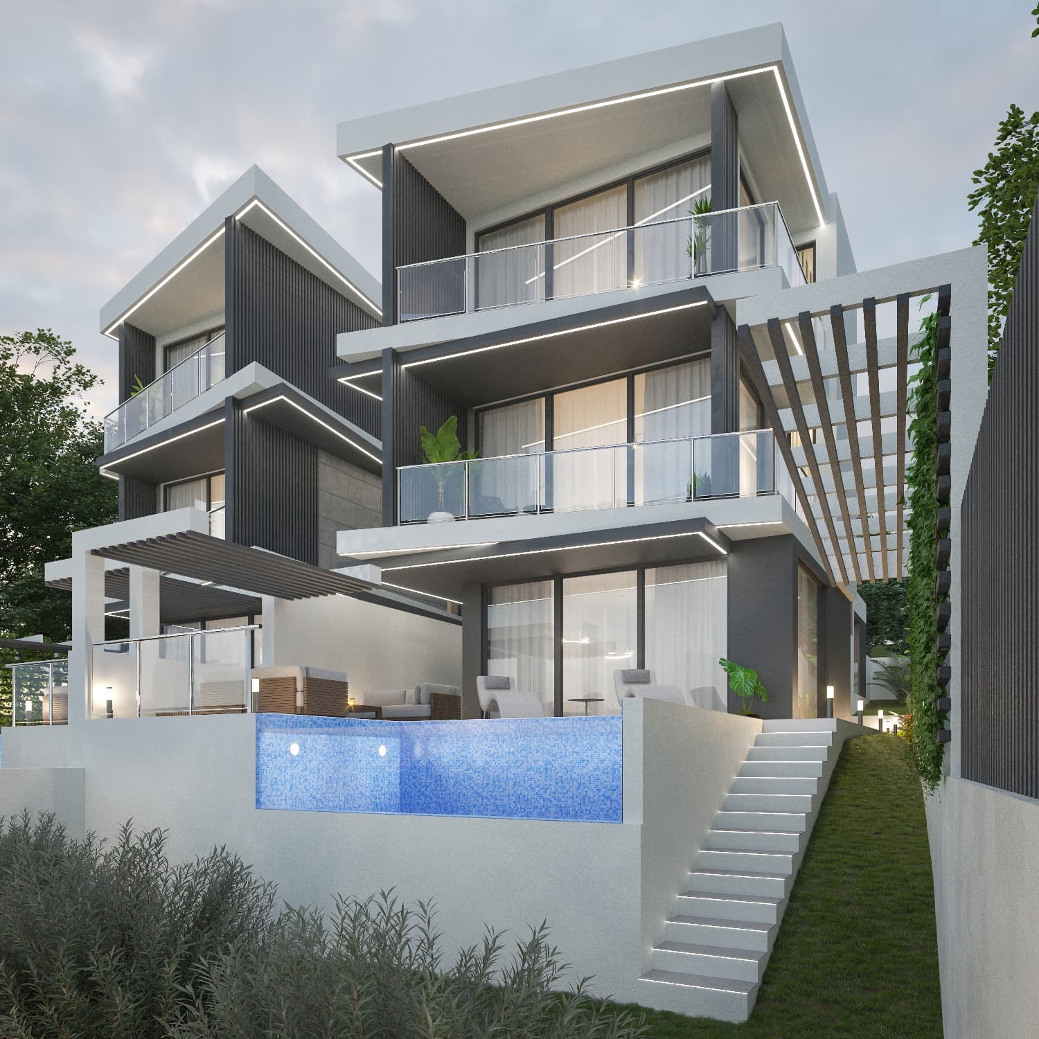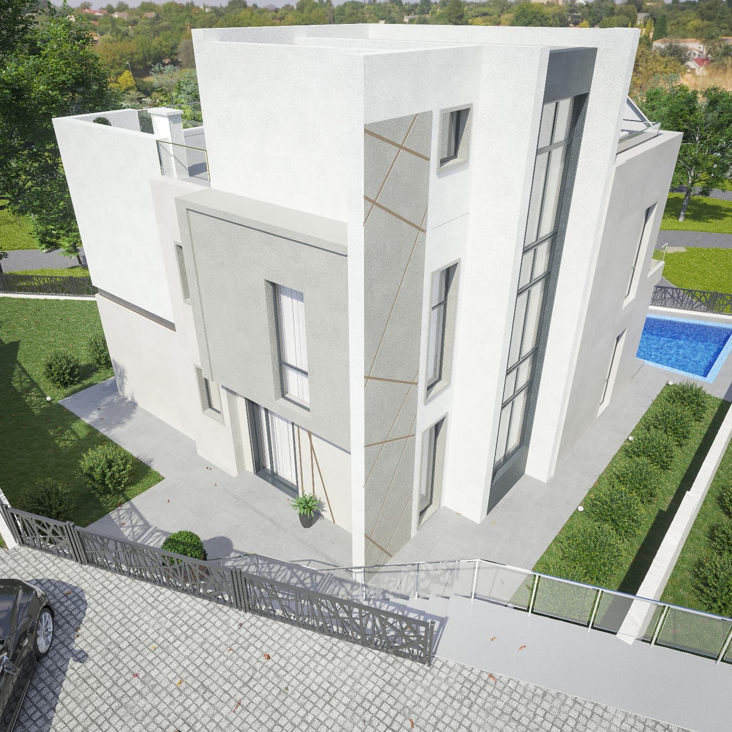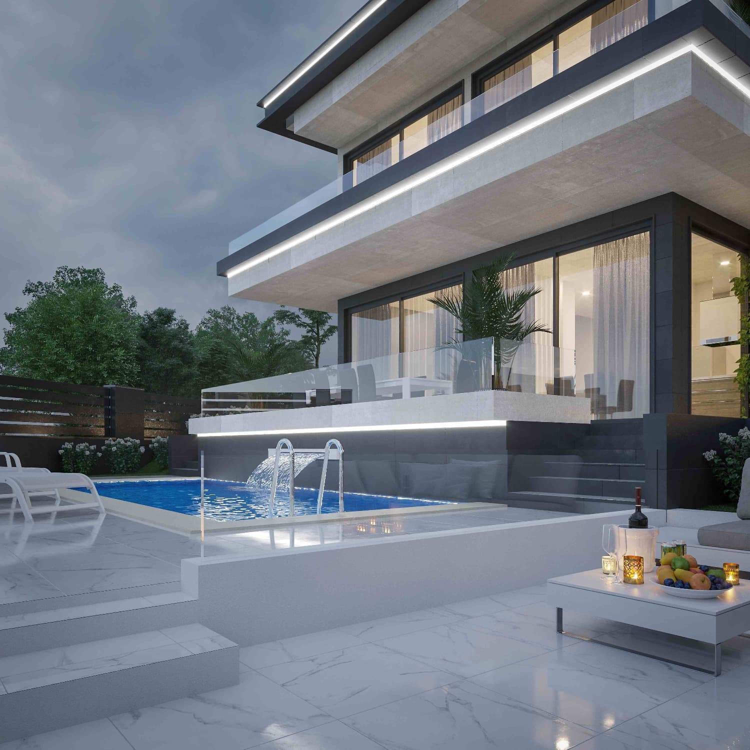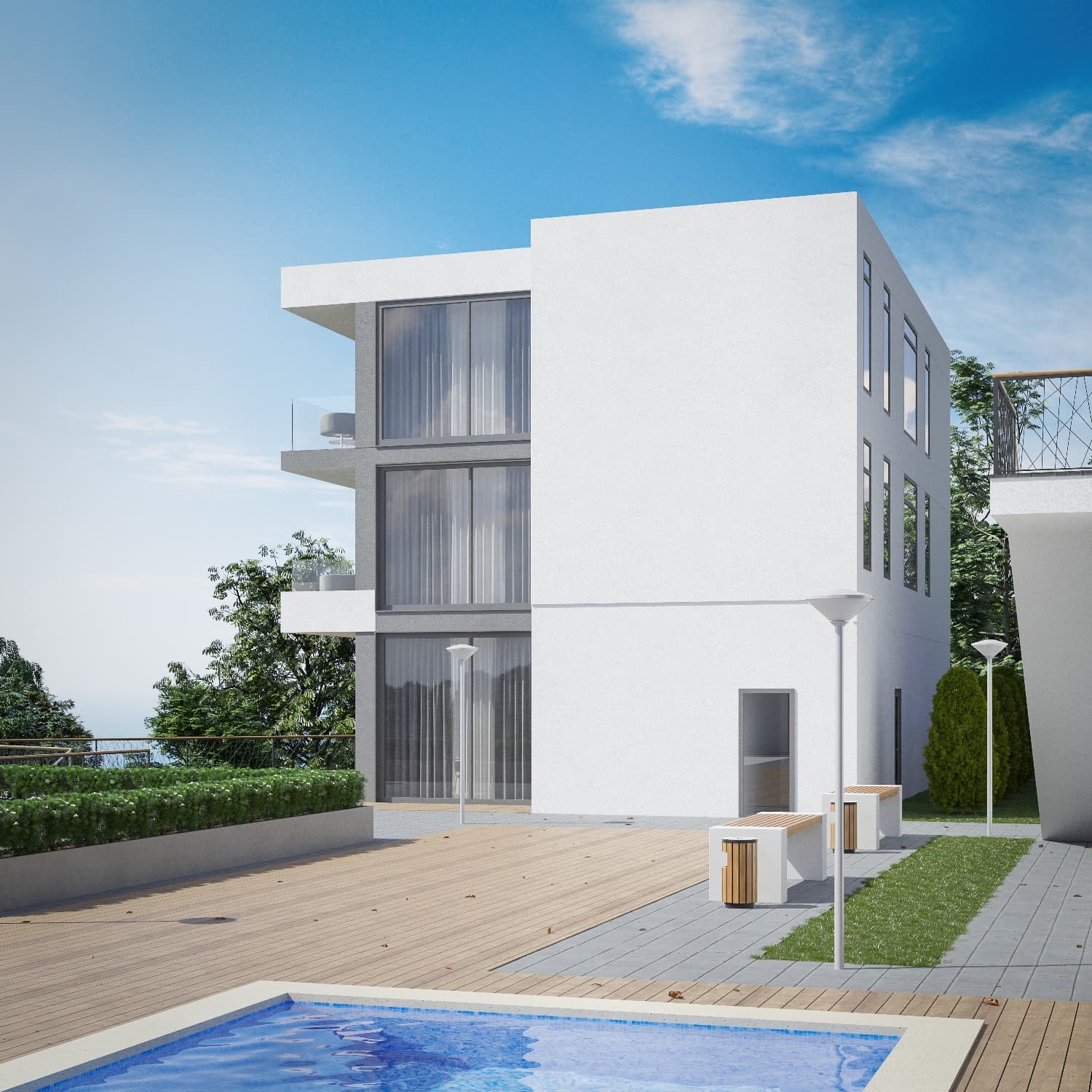 Общая площадь всех этажей с учетом бассейна, террас и балконов - 328,59 м2
