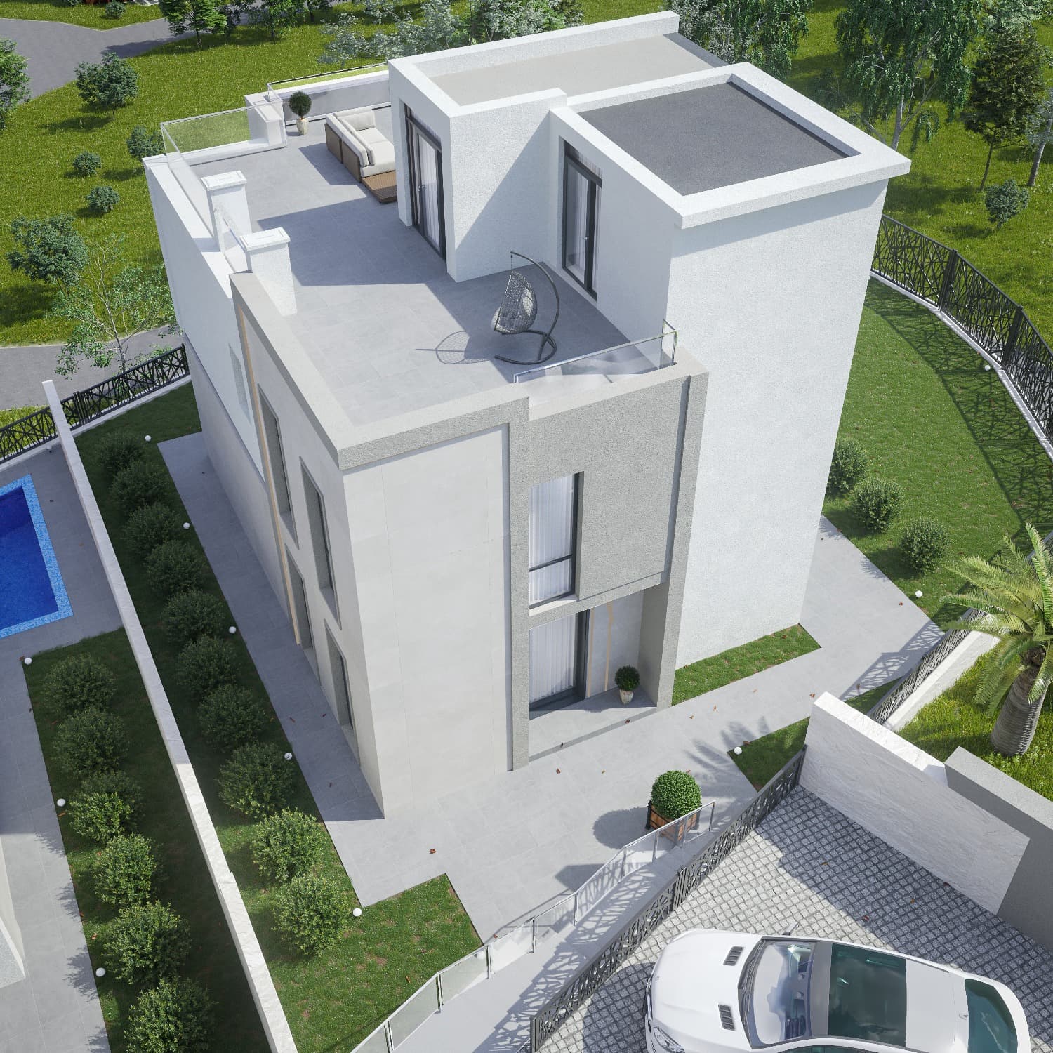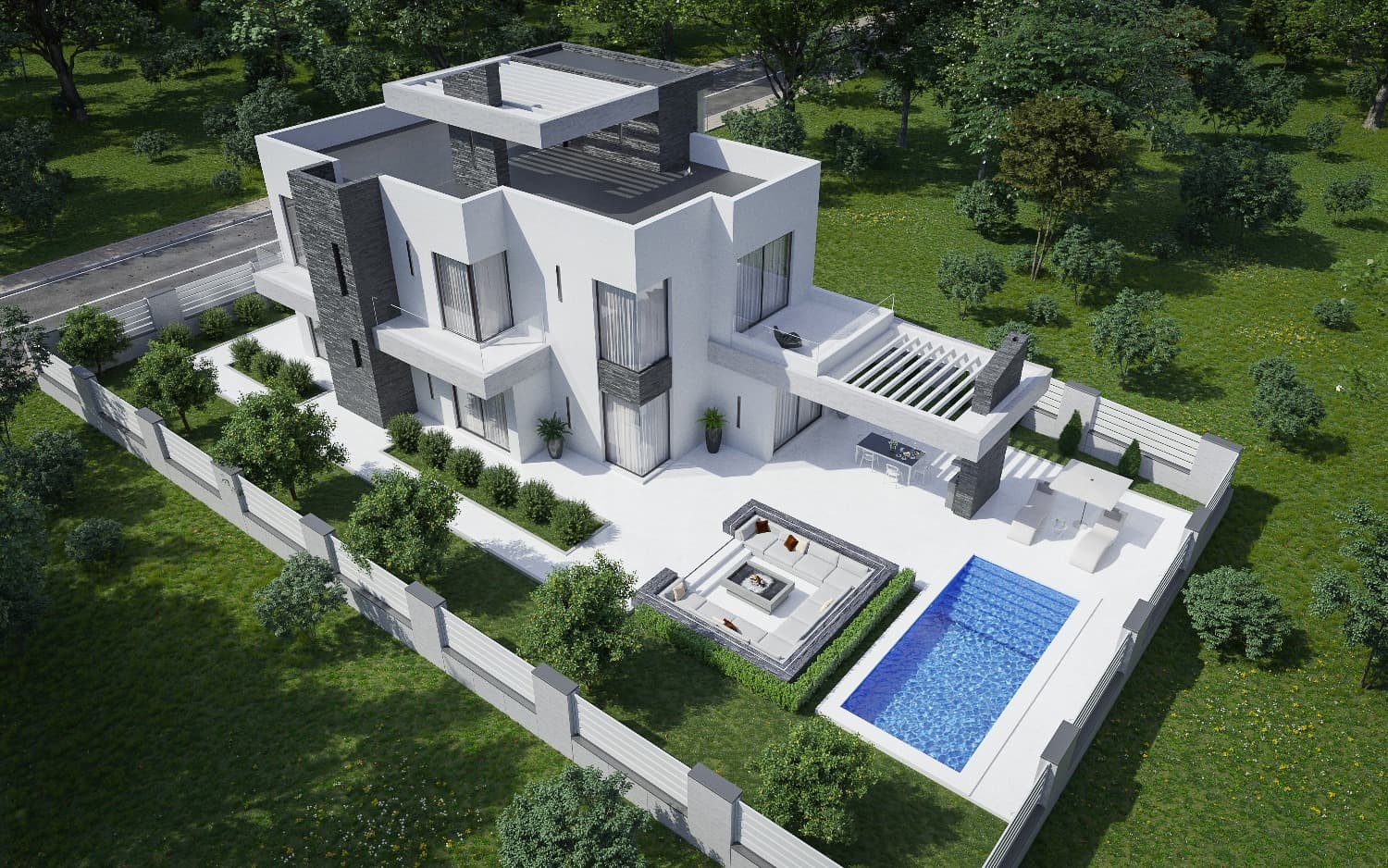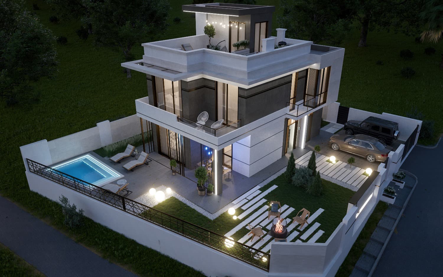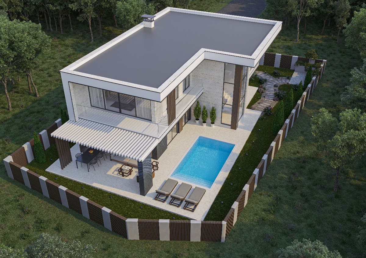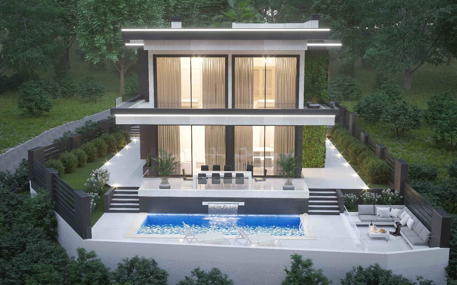 Общая площадь всех этажей с учетом бассейна, террас и балконов - 328,59 м2