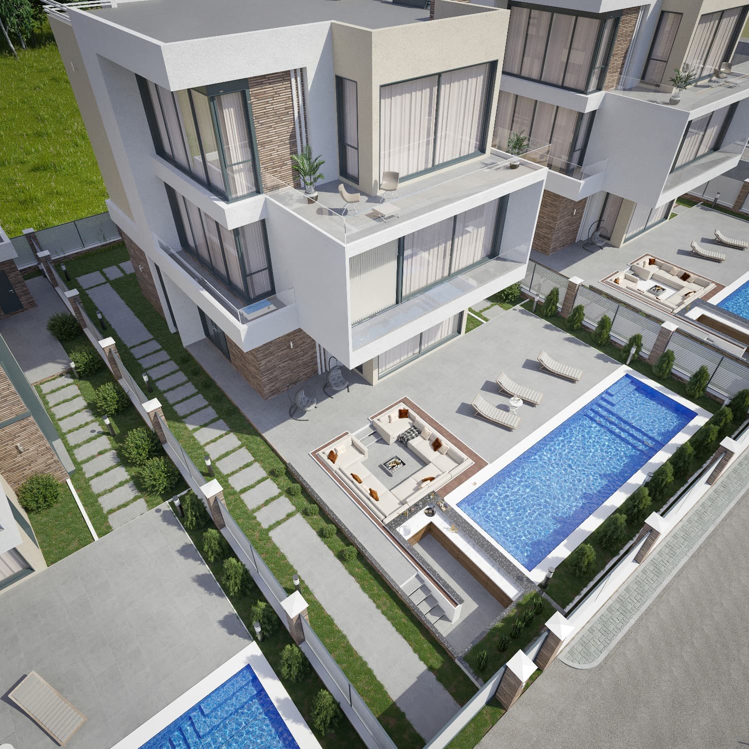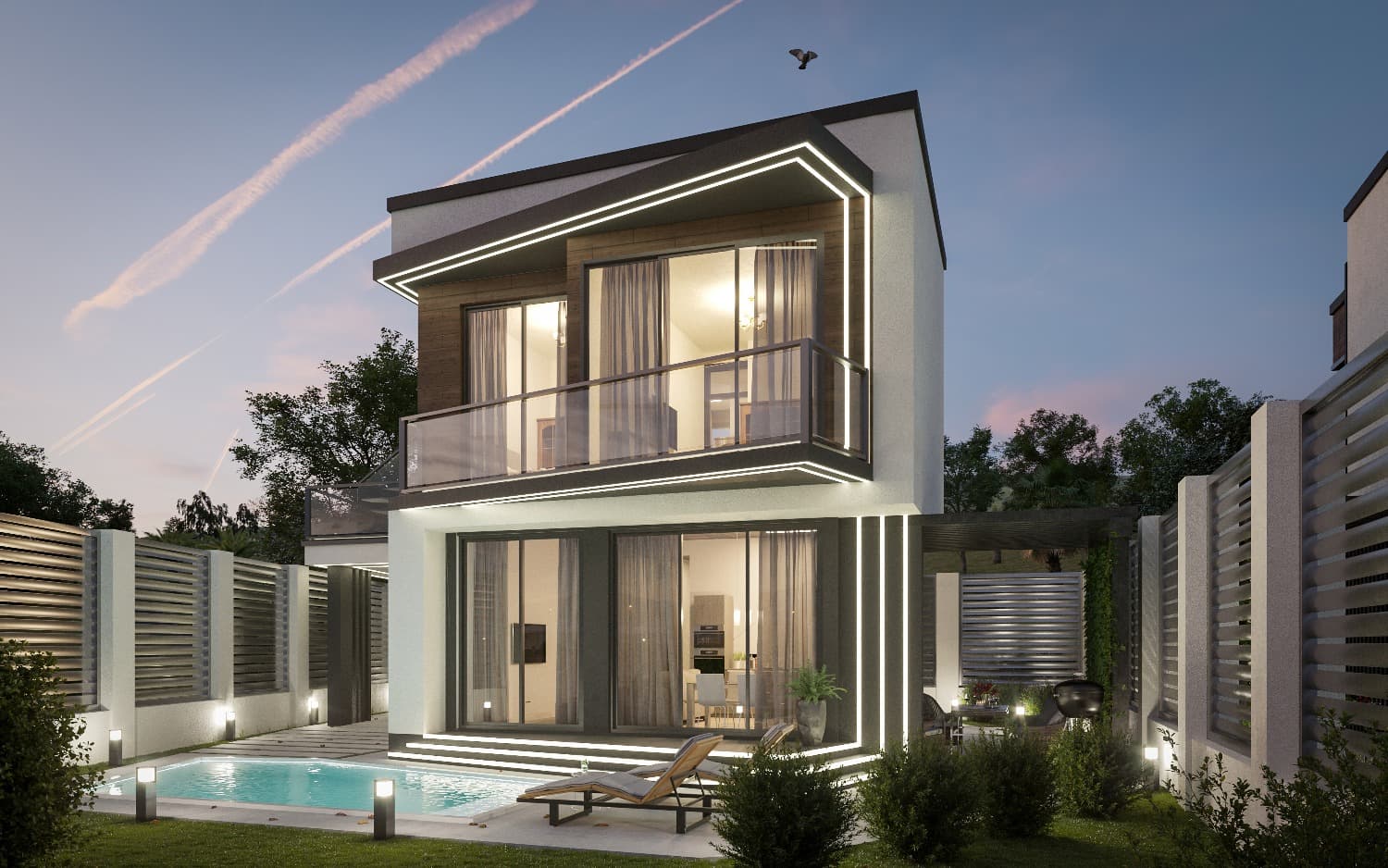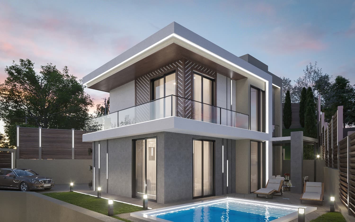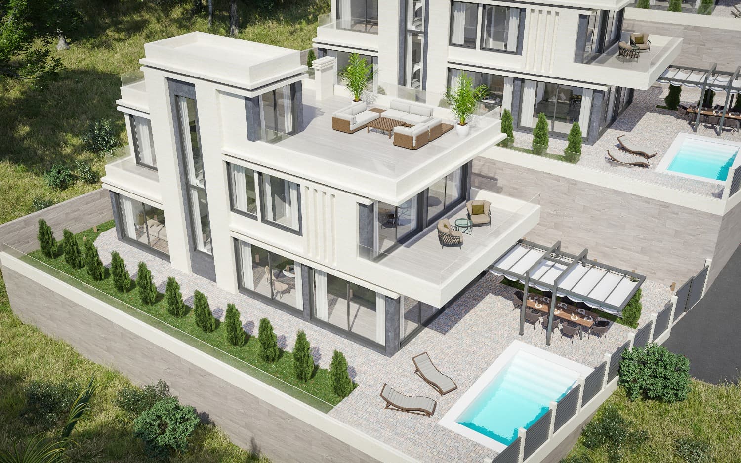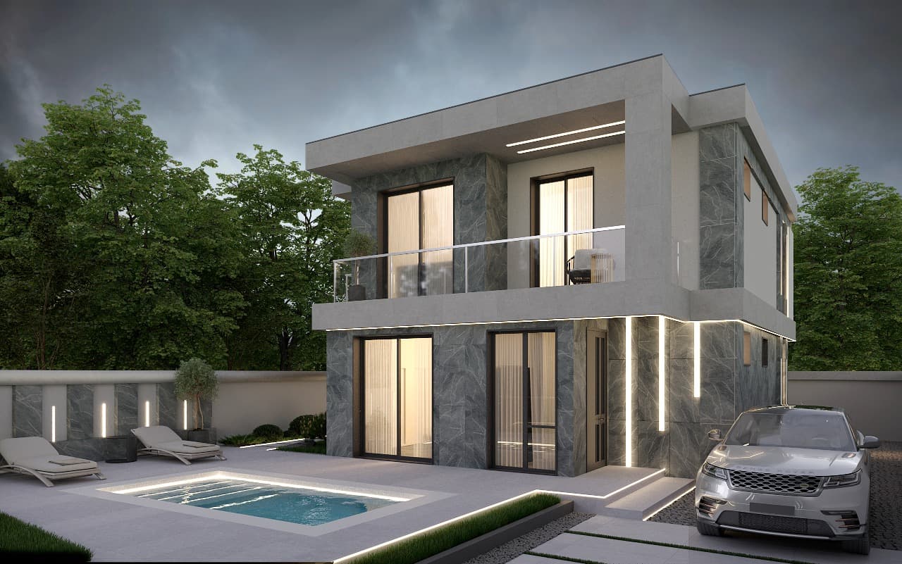 Общая площадь всех этажей с учетом бассейна, террас и балконов - 328,59 м2